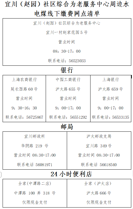 “年纪大了,手机不会用,跑网点又费劲,水电煤缴费真是件头疼事”——这是许多老年居民的共同困扰。为切实破解这一难题,宜川路街道为有需要的社区居民整理了一份缴费网点图。
