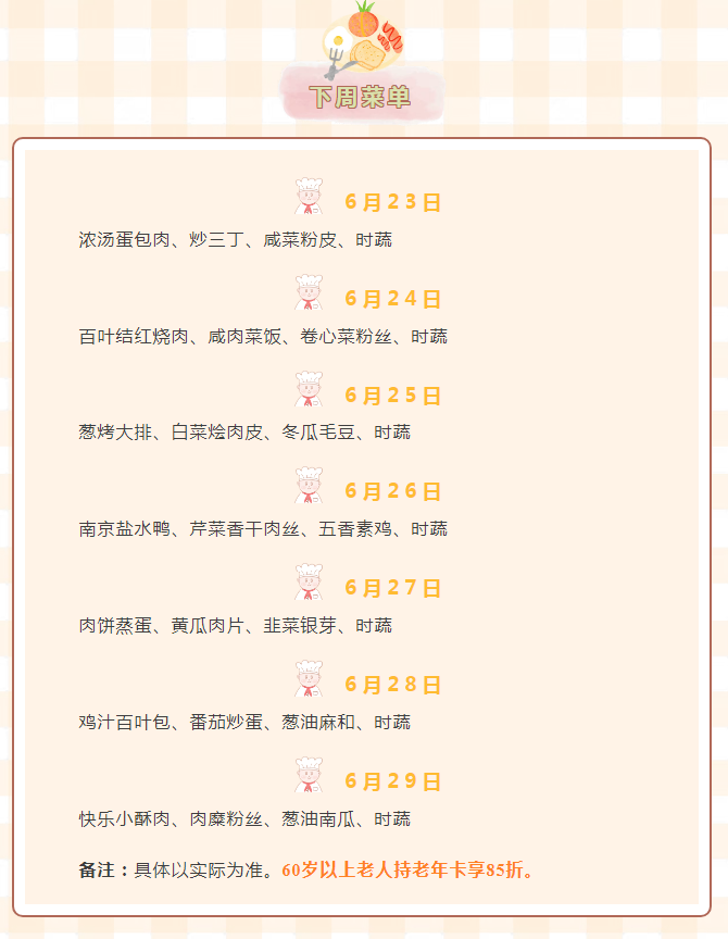 宜川路街道社区食堂每周将根据季节特点,选择当季的新鲜瓜果蔬菜以及肉类,做好营养搭配,让社区老人在摄取足够营养的同时,吃得放心、吃得开心!