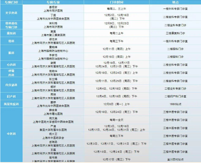 宜川街道社区卫生服务中心专家门诊时间(12月)