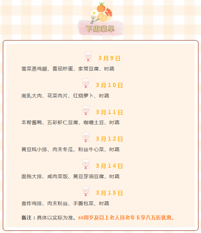 两湾熏鱼、本帮酱鸭……宜川社区食堂一周菜单(3.9-3.15)来啦