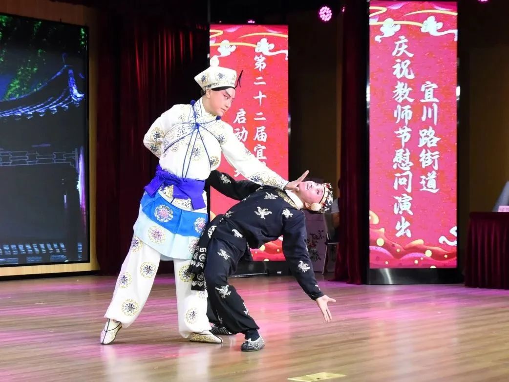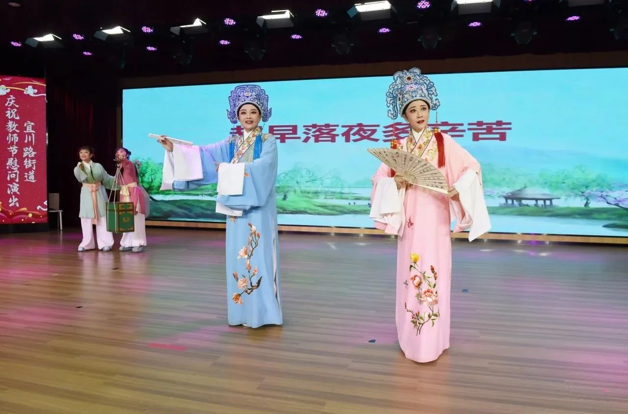 金秋送爽,丹桂飘香。现场慰问演出集结了越剧、京剧、沪剧、评弹等中国传统戏剧形式,其中有越韵宜川青年越剧团带来的越剧三笑《点秋香》、讲述人民教师感化和救助误入歧途女学生故事的越剧现代剧《教师日记》等,旨在向辛勤耕耘在教育战线上的老师们致以崇高的敬意,同时庆祝即将到来的中秋、国庆双节。