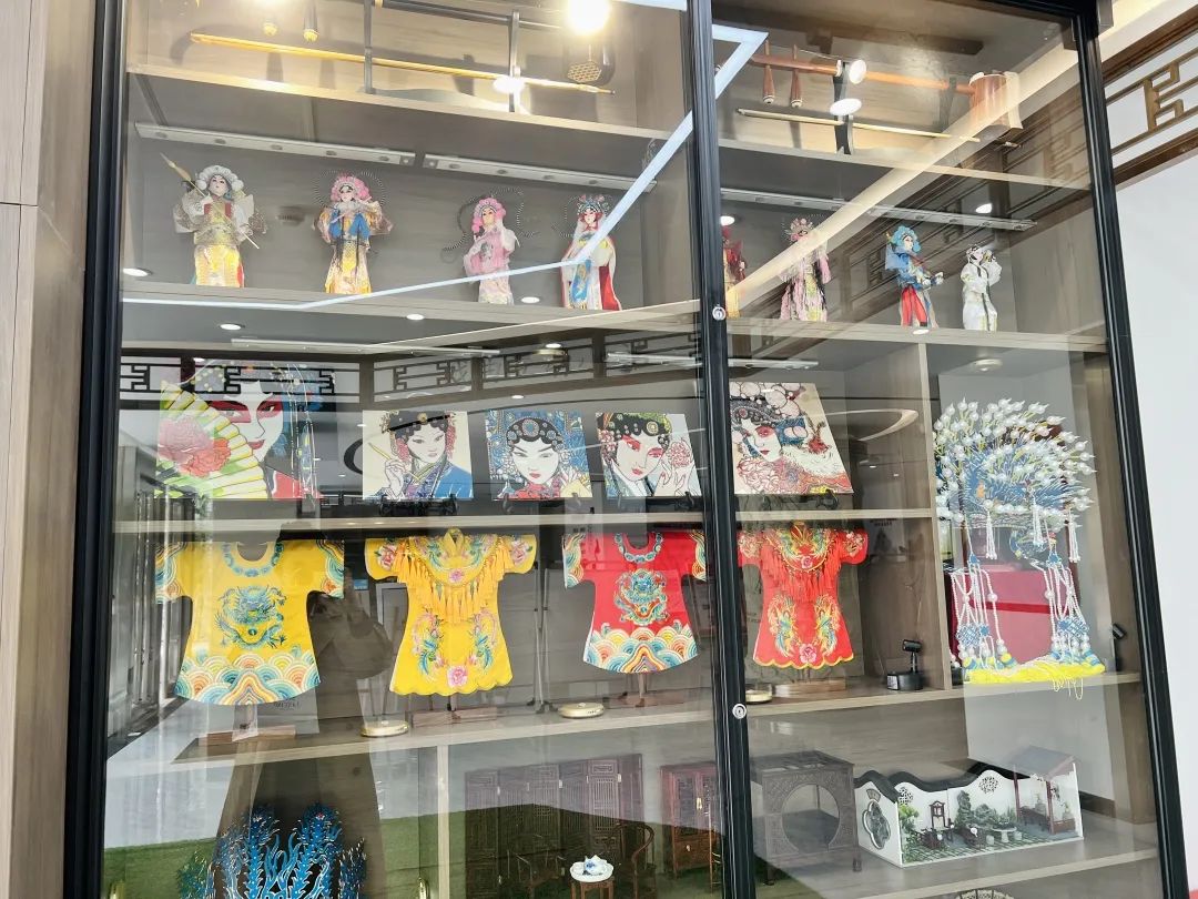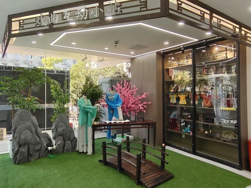 一楼大堂新建戏曲互动小站,展柜内陈列了戏曲服饰及头饰、珠翠、戏曲舞台专用道具,戏曲服装佩件,头盔,鞋帽等,希望通过传统文化的沉浸,让孩子从小有一种文化的熏陶,以戏曲服饰、配饰为载体,让大众了解我国民俗戏曲艺术。