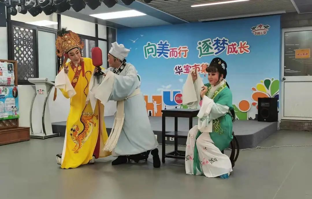 在华阴小学活动室,上海越韵宜川青年越剧团团长唐敏与越剧演员王瑾、瞿冬梅、薛菲、宋梅、陈歆为学生们带来了经典越剧《王老虎抢亲》选段《戏豹》,《梁祝》选段《十八相送》,《卖油郎》选段《钟情》等剧目,受到了学生们的喜爱。