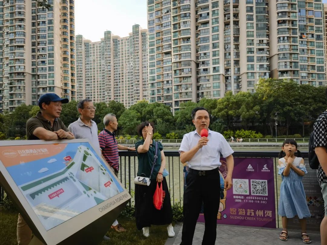 一路上,随着游船轻摇,志愿者宣讲老师带领大家路经天安千树、上海纺织博物馆、M50创意产业园、四行仓库、上海总商会、河滨大楼、上海大厦、上海邮政博物馆等苏州河地标,一系列特色“景点”映入眼帘,缓缓划过视线。伴随志愿者老师的沉浸式课堂,城市的过去与现在“悠游苏河湾”航线串珠成链,无论是红色建筑、工业遗存还是时尚打卡地,一时都有了全新的视角。