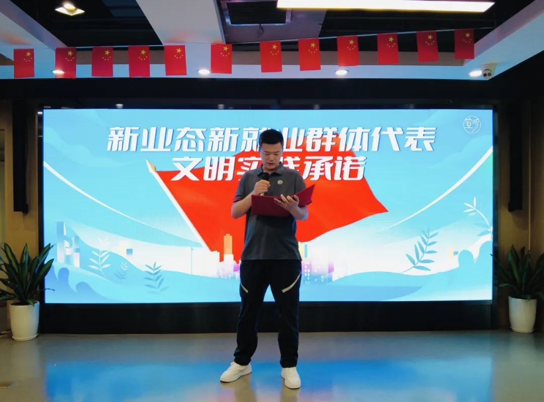 新业态新就业群体代表上台,郑重地作出了文明实践承诺。快递“小哥”们表示将严格遵守,从自身做起、从身边做起、从小事做起,做到带头讲文明、树新风,以实际行动做文明的引领者、实践者、推动者,共同营造更加靓丽、文明、和谐的工作、生活环境。
