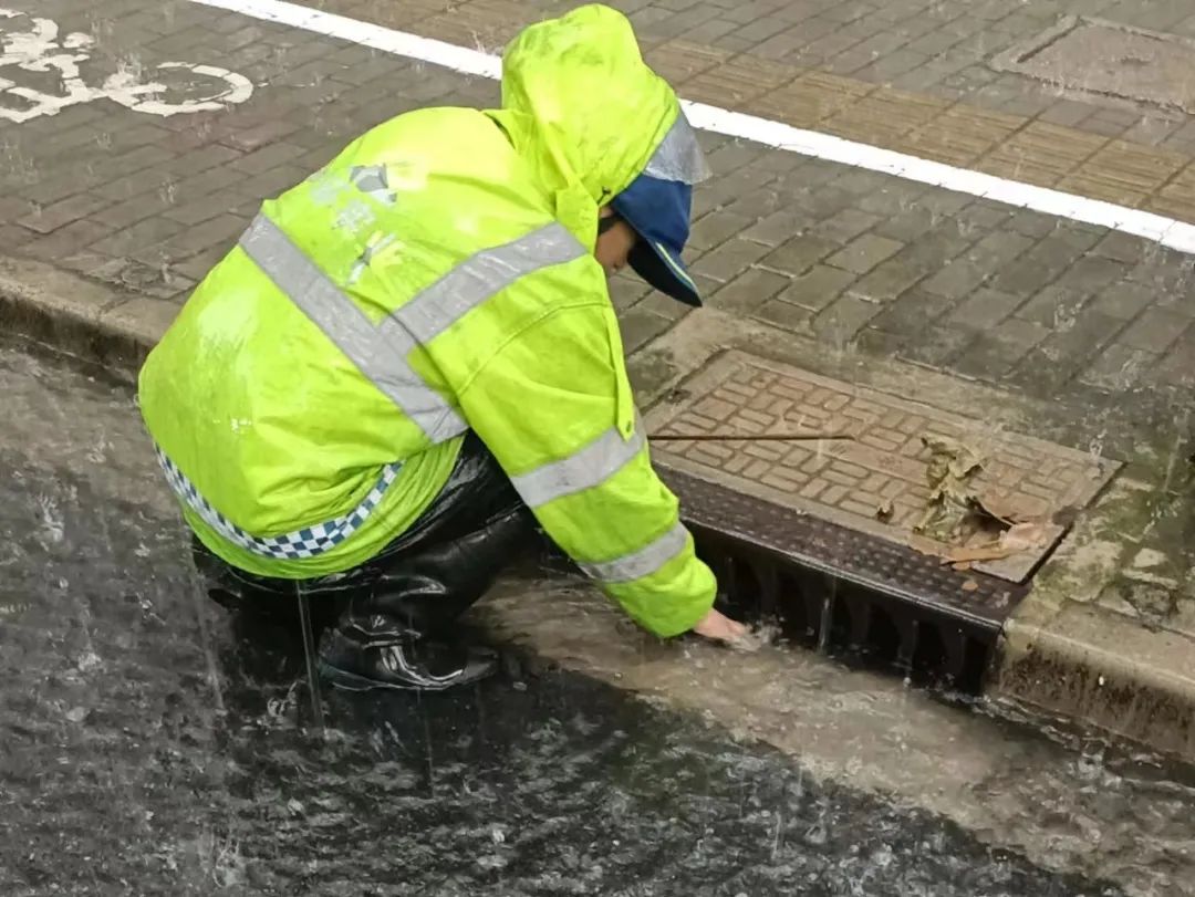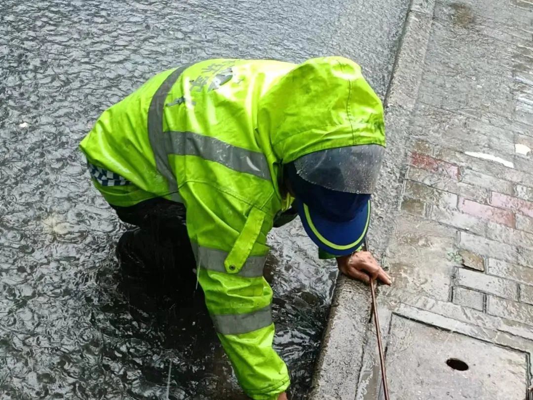 除此之外,普环一分公司陈扣娣劳模班的成员们也纷纷冒着大雨,清理路面排水口,进一步确保路面积水排出。