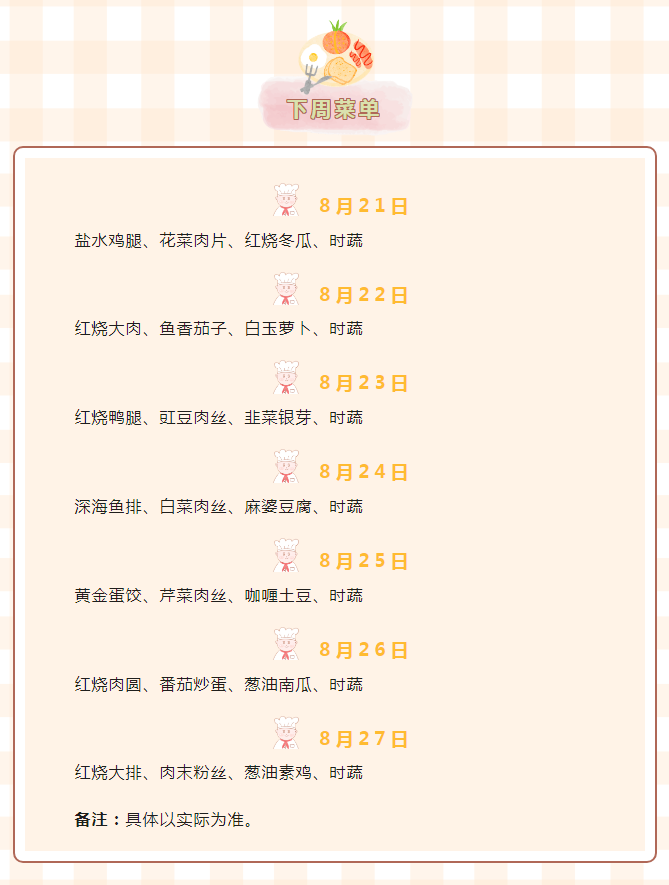 宜川路街道社区食堂每周将根据季节特点,选择当季的新鲜瓜果蔬菜以及肉类,做好营养搭配,让社区老人在摄取足够营养的同时,吃得放心、吃得开心!现在,就跟随小宜去看看下周社区食堂的菜单吧