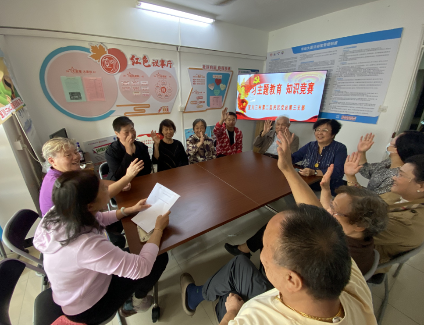 在华经大厦红色议事厅,宜川三村第二居民区党总支还举办了一场知识竞赛,比赛现场,气氛既紧张又热烈,党员们积极踊跃参与。