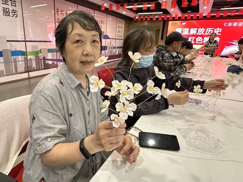 活动中,香溢党群服务中心特邀手工老师带领社区居民动手制作上海市的市花——白玉兰串珠花束。此次活动不仅让居民们亲身体验了手工制作的乐趣,也让他们更加了解了上海这座城市的文化和历史。