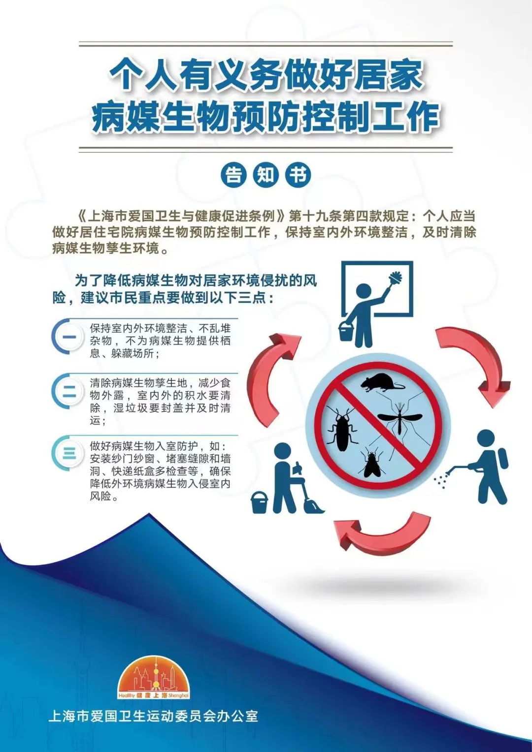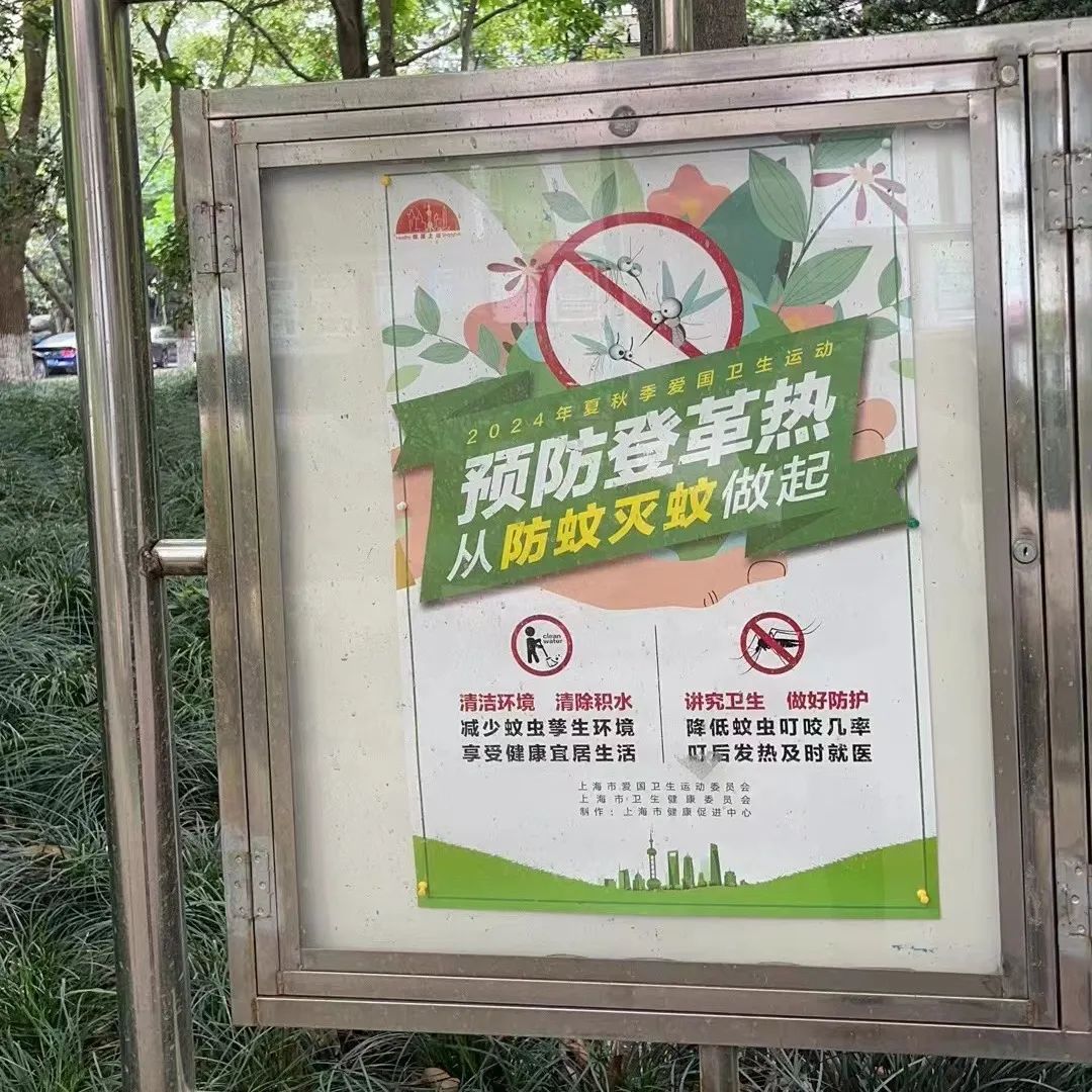 位于普陀区的中远两湾城住宅小区内,每一栋居民楼前和告示栏内,均张贴着这份《7月绿化消杀通知》,包括消杀时间、对象、范围和注意事项等。除此之外,中远两湾城开设健康科普直播,组织线下主题讲座,向辖区及沿街单位、个人发放病媒生物预防控制告知书,进一步加大宣传力度督促社区居民管好各类水缸、盆景和花盆托盘内的积水及浇花用水,能加盖的容器要做到严密加盖,消除蚊虫孳生环境,在全社区广泛宣传倡导“个人是健康第一责任人”理念。