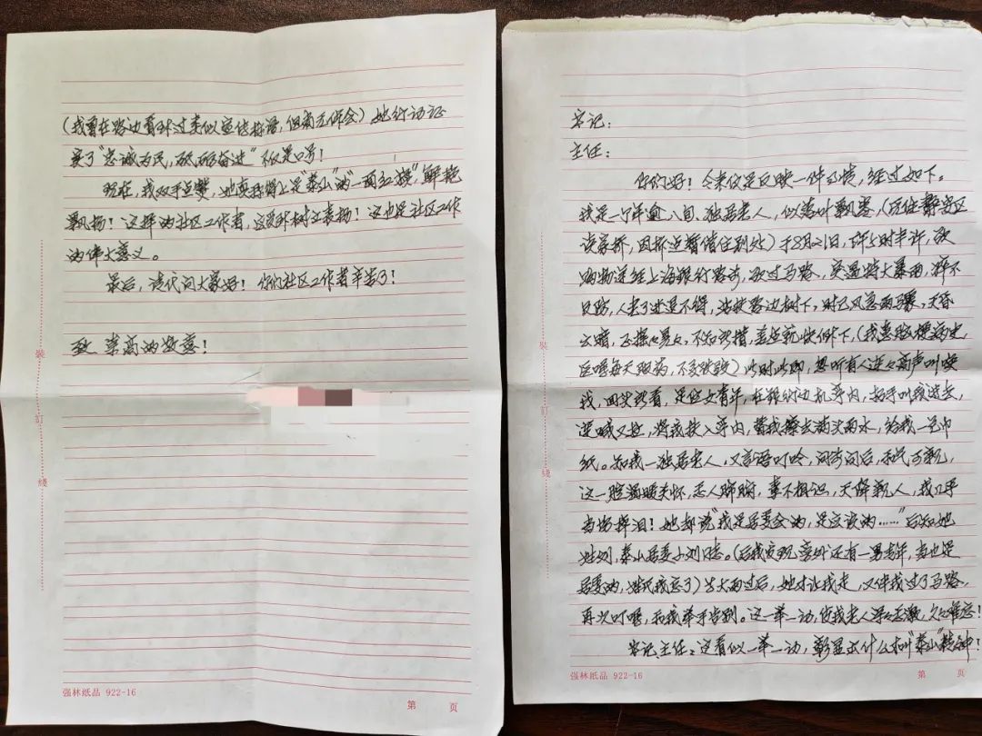 日前,泰山宅居委会刘琴琴途遇一老人无助立于街头。见状,刘琴琴迅速上前,搀扶至银行亭内避雨,并为老人拂去身上雨水,尽显关怀备至。事后,老人满怀感激之情,亲笔撰写感谢信送至居委会,字字句句洋溢着对她对老人关爱的深深谢意。