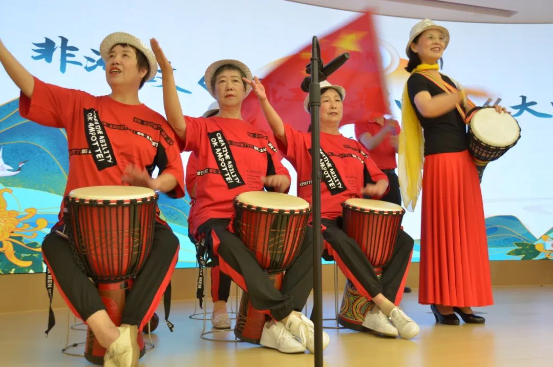 此外,王彩菊老师的女生独唱《祖国,慈祥的母亲》深情表达了对祖国母亲的无限热爱;美玉舞蹈队的筷子舞《敕勒歌》让人眼前一亮,生动地展现了草原儿女的热情与豪迈;中华韵舞蹈队的《长江之歌》以韵律操的形式描绘了长江的磅礴气势和深厚底蕴,而乐龄欢乐艺术团的非洲鼓表演《丽江三部曲》和《大中国》则以激昂的鼓声和欢快的节奏表达了对伟大祖国的热爱与祝福,把整场演出推向了最高潮。