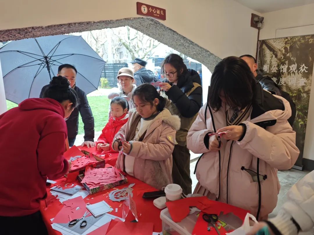 参观者们被袁吟轩的技艺所吸引,纷纷围拢过来。大家一边欣赏她的创作过程,一边赞叹不已。一位来自外地的游客感慨地说:“过年能在一大会址看到这么精彩的剪纸表演,收到这么有意义的新春礼物,真是太难忘了。这不仅让我们感受到了浓浓的年味,更让我们对传统文化有了更深的认识和喜爱。” 还有小朋友们充满好奇地围在袁吟轩身边,眼睛一眨不眨地看着她剪纸,不时发出惊叹声。袁吟轩也耐心地向大家讲解剪纸的技巧和文化内涵,鼓励小朋友们学习和传承这一古老的艺术。