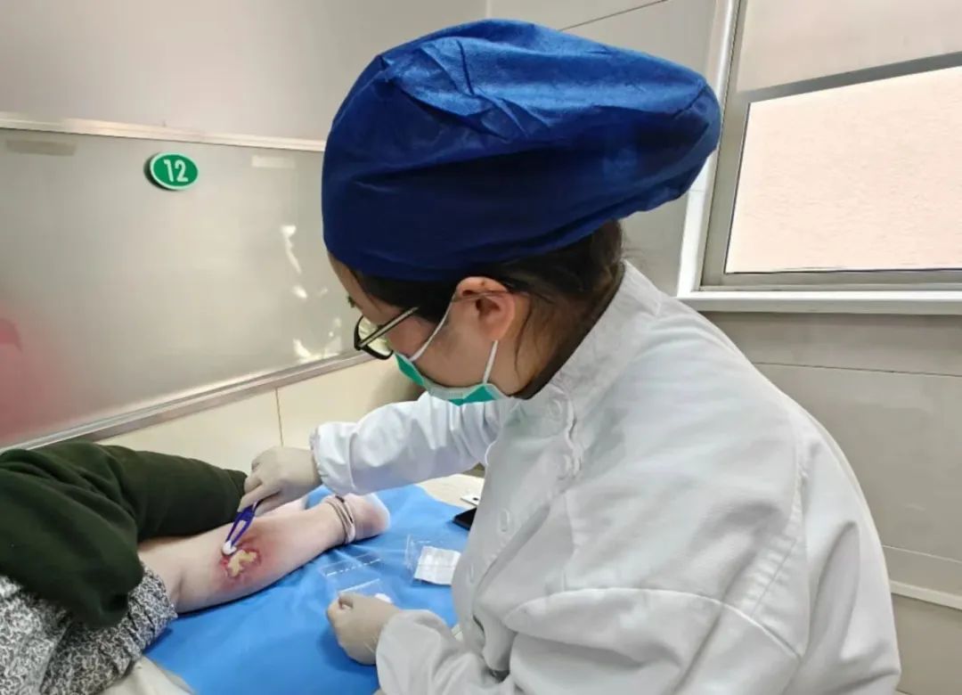 春节假期前夕,家住宜川路街道的70多岁老人曹阿婆在家中无明显诱因下发生了糖尿病下肢溃疡,他的老伴带着她,抱着试一试的心情走进了护理中心门诊综合护理服务区,经过全身评估、伤口评估,伤口护理团队为她制定了一系列护理措施。经过十几天的换药,伤口逐渐有了好转迹象,老人的身体和心理都得到了很大宽慰。当得知8天春节长假中,可以得到持续的护理服务,曹阿婆和老伴连连致谢。