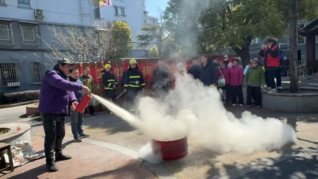 由宜川路街道安办安全专员讲解防火及演示灭火器“提、拔、握、压”四步操作法,正确鉴别灭火器材种类,正确使用的相关知识。随后,在小区广场进行消防安全实战演练。