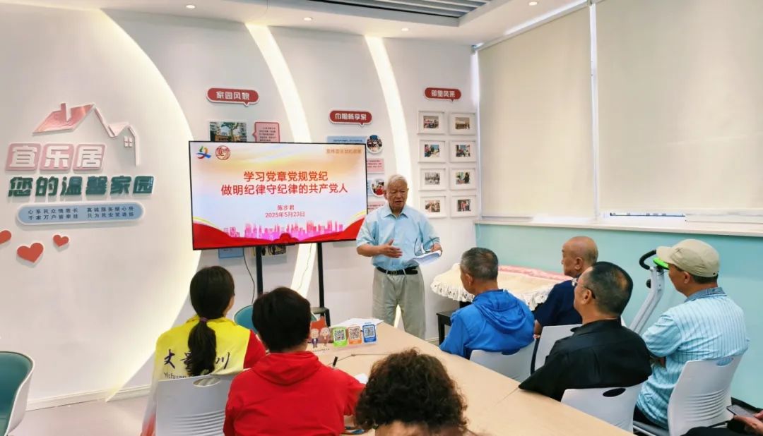 2025年06月10日 来源: 宜川路街道为推动深入贯彻中央八项规定精神学习教育走深走实,抓好党性党风党纪教育一体贯通,近日,宜川路街道新时代文明实践分中心联合街道老干部部门共同在宜川二村第一居民区开展“专题党课进社区”活动,特邀宜川普老宣讲团团长陈步君以《学习党章党规党纪 做明纪律守纪律的共产党人》为主题授课,紧扣“学思想 强作风 建新功”主线,引导社区党员、居民区干部把学习成果转化为为民服务、干事创业的实践本领,推动基层治理提质增效。