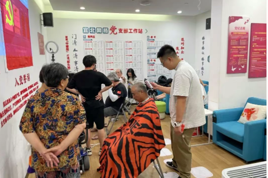 “公益理发义剪”服务成为集市亮点。理发店志愿者携带工具,老人提供理发。在活动开始前已有居民在现场排队。一把剪刀,剪出的不仅是发型,更是对长者的关怀与尊重。