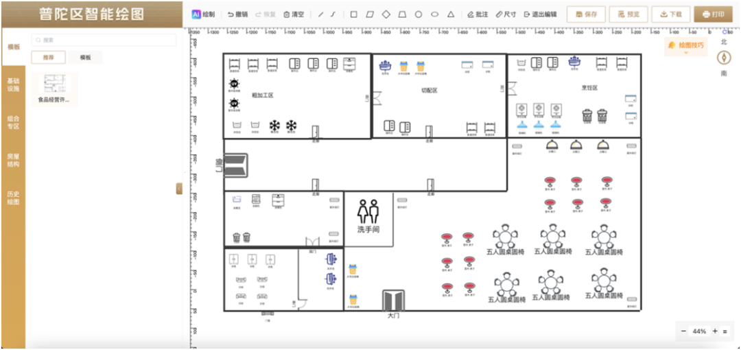 其搭载的智能绘图能力,通过专业绘图工具矩阵,提供模板绘制、组合绘制、AI绘制等多元绘制方式。无论是直接选用适配模板快速生成,还是自由组合基础元素搭建,亦或是由AI根据需求自动生成雏形,都能让无专业绘图基础的开店者轻松上手,大幅降低平面图绘制的技术门槛,从绘制环节为开店者最大化压缩时间与经济成本。