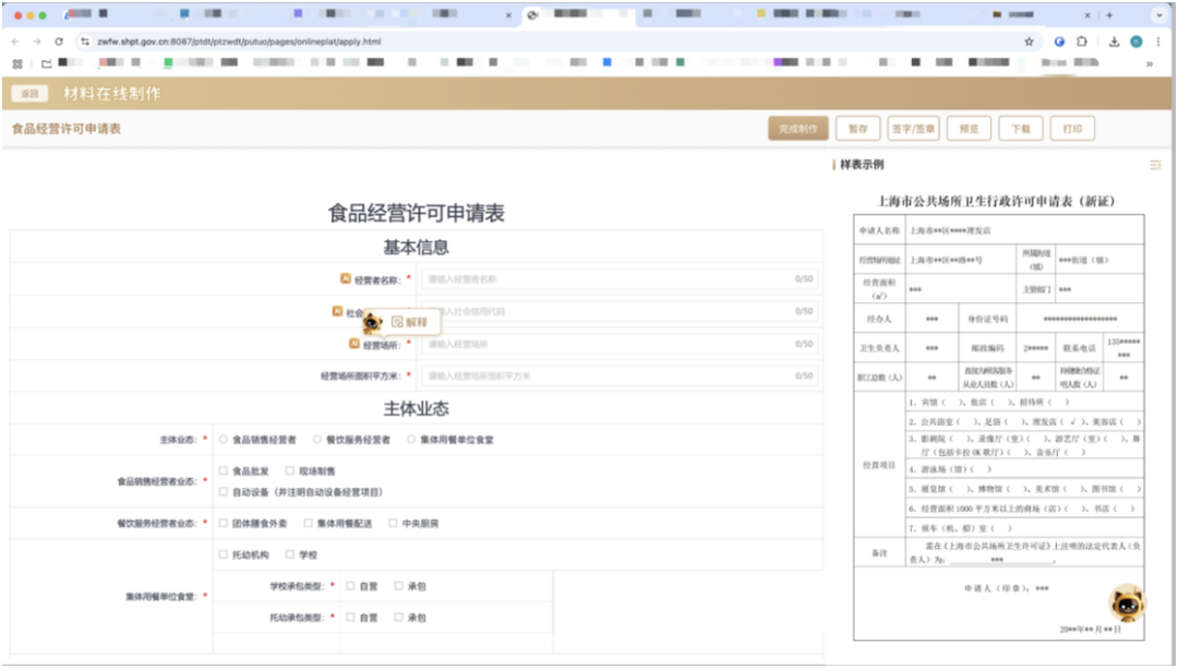 专属的材料制作助手搭载强大功能,不仅为开店者提供申请表补表支持,更依托数源整合与大模型识别能力实现申请表智能预填,大幅减少手动填写量。同时联动AI助手助填能力,全程为开店者提供精准指引与辅助,有效降低材料准备的专业门槛与操作难度,显著节省准备时间,为开店手续办理按下“加速键”。