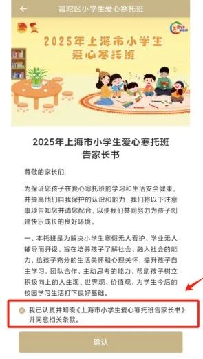 2.阅读《2025年上海市小学生爱心寒托班告家长书》,勾选“我已认真并知晓”,点击“确定”。