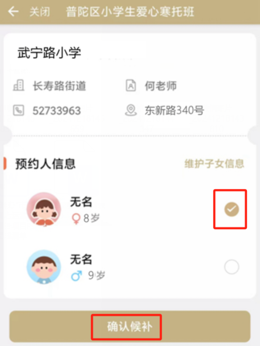 2.勾选需要候补的子女,点击“确认候补”即可。若已报名成功的人取消报名,系统将自动按照候补顺序依次递补。