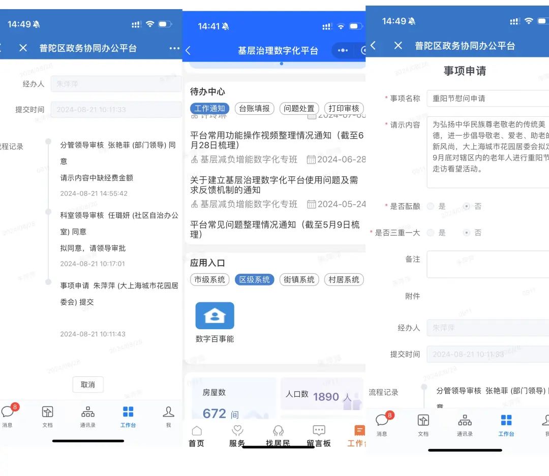 为此,今年7月,由普陀区区委办牵头,区委社会工作部、区委组织部、区数据局、长寿路街道、大上海城市花园居民区共同搭建了数字居委会建设专班,聚焦“纸质审批流转”这一关键问题,就数字居委会建设中深化数字协同功能正式开启了试点创新改革项目。今年8月,普陀开始试点社工报批申请工作的线上流转、一网协同。