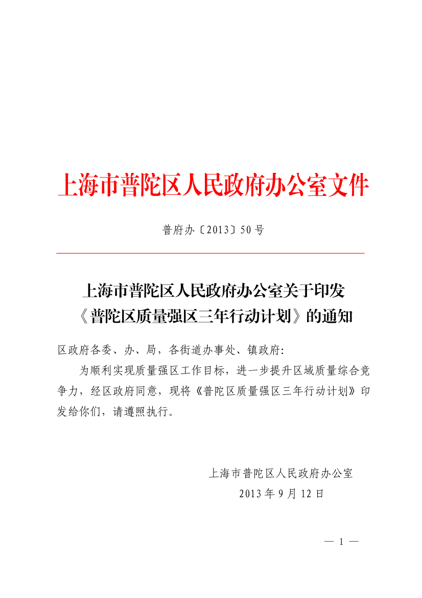 上海市普陀区人民政府办公室关于印发《普陀区质量强区三年行动计划》的通知