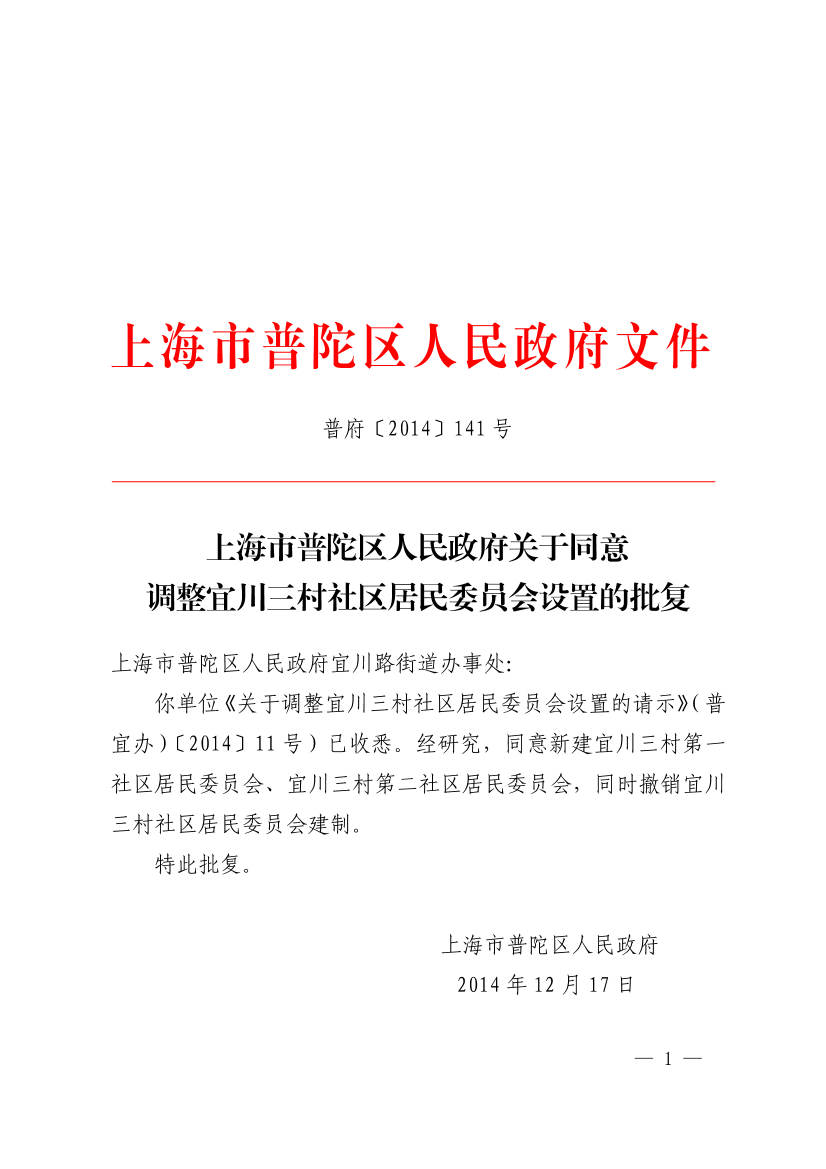 你单位《关于调整宜川三村社区居民委员会设置的请示》(普宜办)〔2014〕11号)已收悉。经研究,同意新建宜川三村第一社区居民委员会、宜川三村第二社区居民委员会,同时撤销宜川三村社区居民委员会建制。