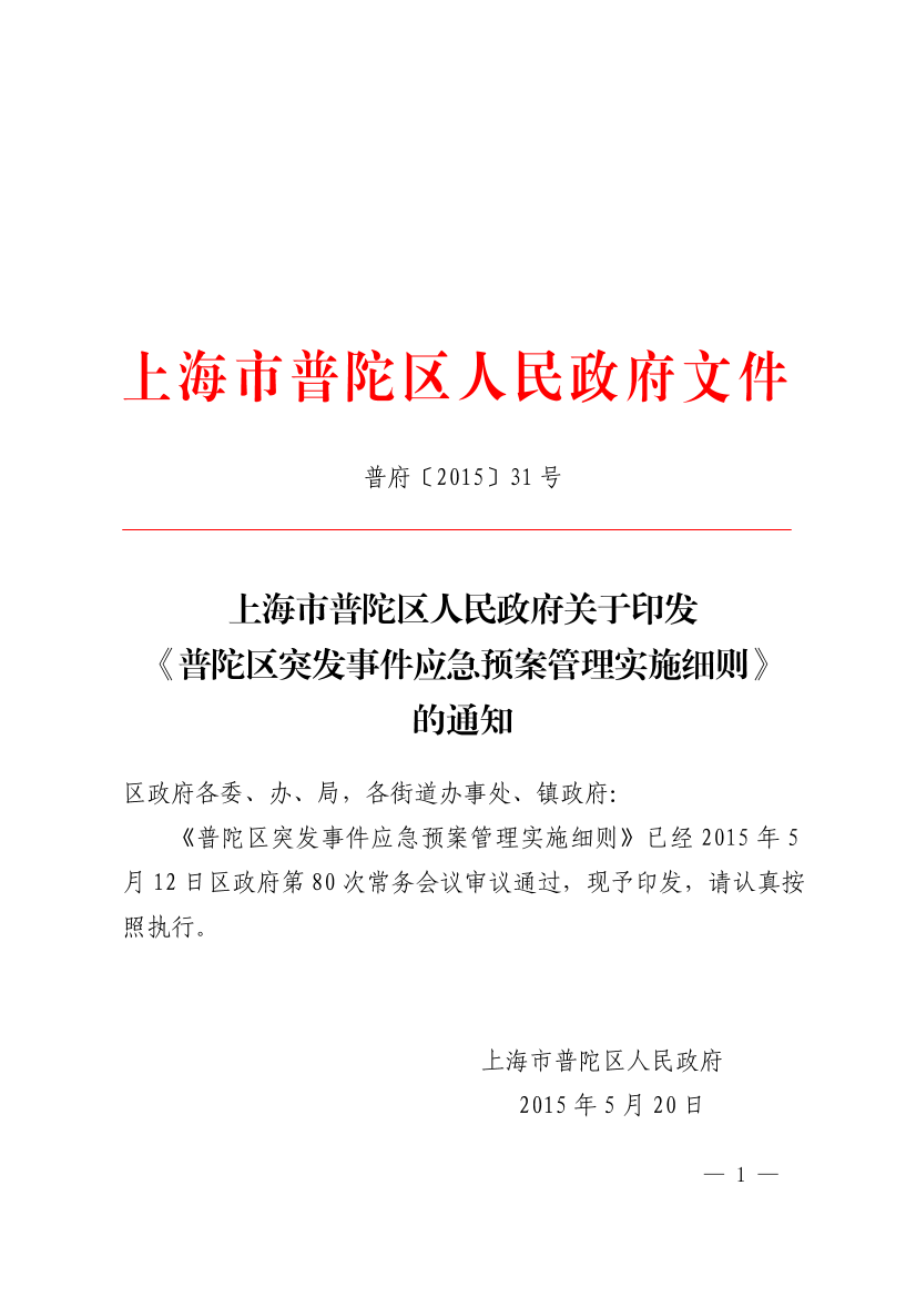 《普陀区突发事件应急预案管理实施细则》已经2015年5月12日区政府第80次常务会议审议通过,现予印发,请认真按照执行。