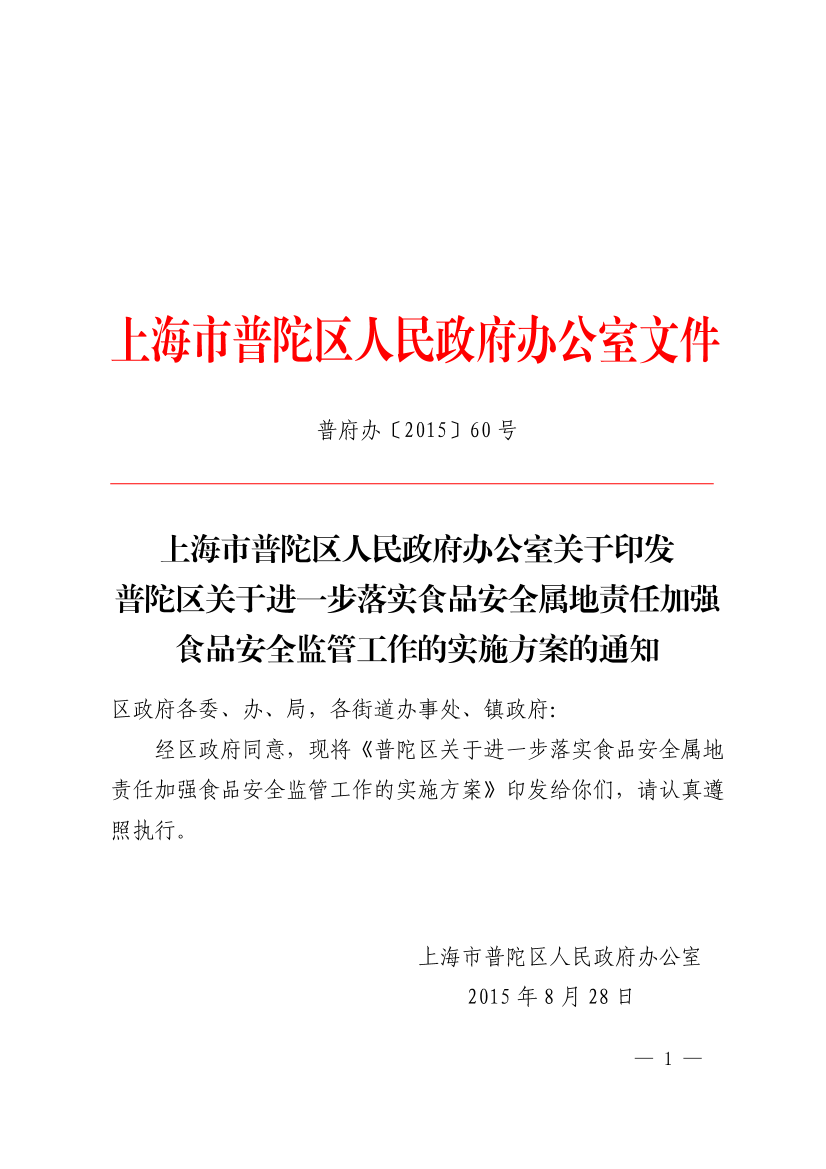 关于印发普陀区关于进一步落实食品安全属地责任加强食品安全监管工作的实施方案的通知