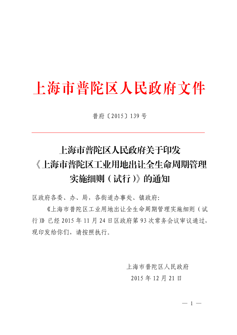 关于印发《上海市普陀区工业用地出让全生命周期管理实施细则(试行)》的通知