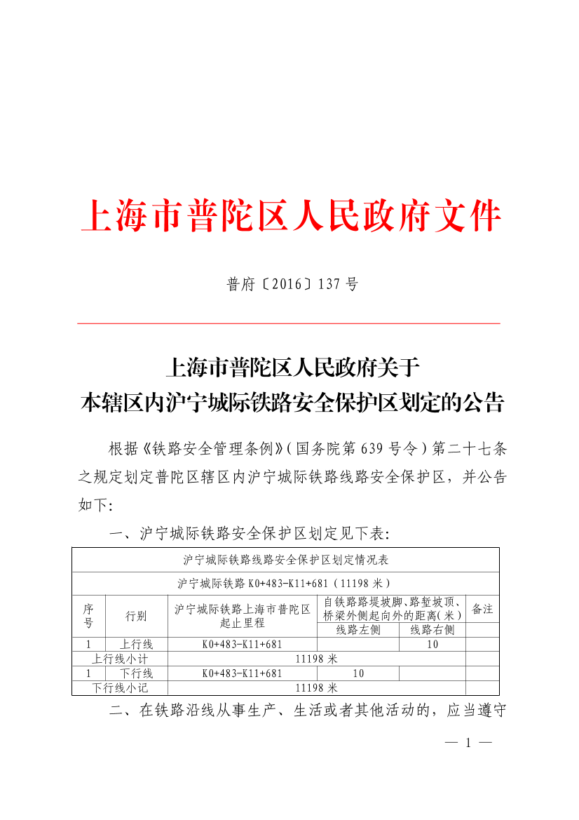 根据《铁路安全管理条例》(国务院第639号令)第二十七条之规定划定普陀区辖区内沪宁城际铁路线路安全保护区,并公告如下: