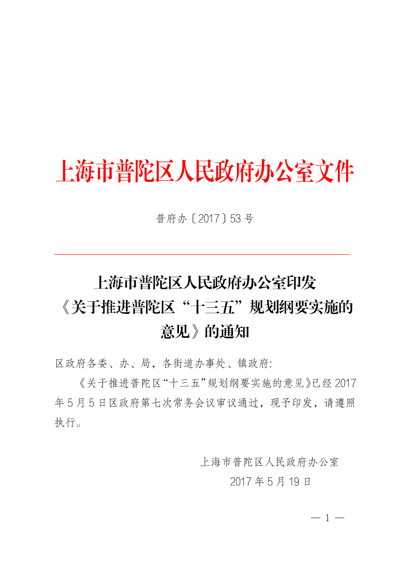 《关于推进普陀区“十三五”规划纲要实施的意见》已经2017年5月5日区政府第七次常务会议审议通过,现予印发,请遵照执行。