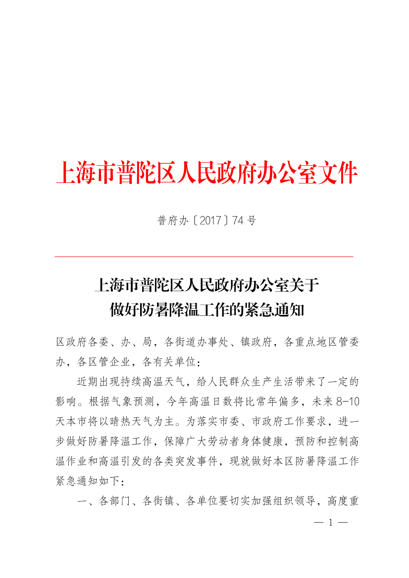 上海市普陀区人民政府办公室关于做好防暑降温工作的紧急通知