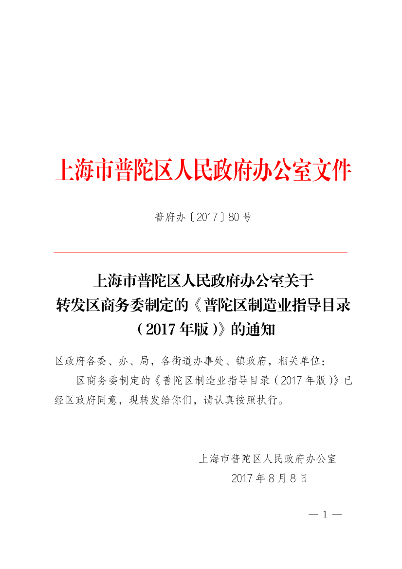 上海市普陀区人民政府办公室关于 转发区商务委制定的《普陀区制造业指导目录 (2017年版)》的通知