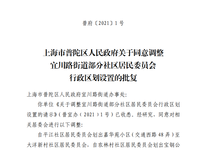 你单位《关于调整宜川路街道部分社区居民委员会行政区划设置的请示》(普宜办﹝2021﹞1号)已收悉。经研究,同意对相关居委会进行以下调整: