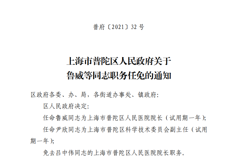 任命鲁威同志为上海市普陀区人民医院院长(试用期一年);