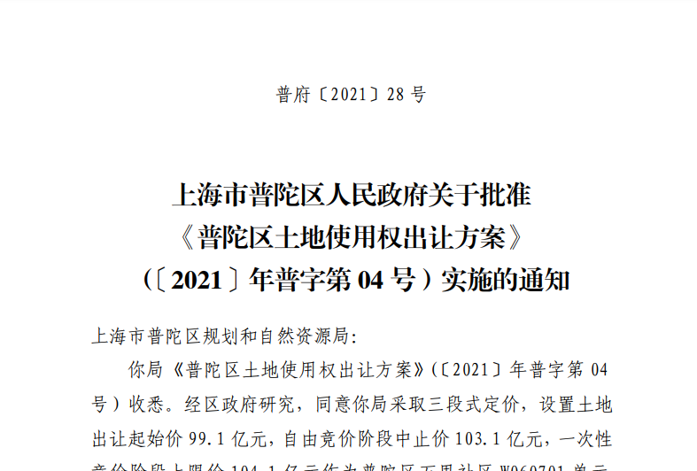 上海市普陀区人民政府关于批准《普陀区土地使用权出让方案》(〔2021〕年普字第04号)实施的通知