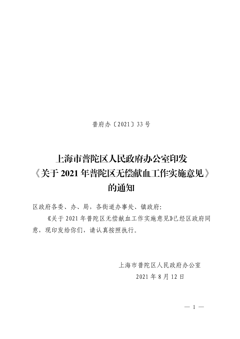 上海市普陀区人民政府办公室印发《关于2021年普陀区无偿献血工作实施意见》的通知