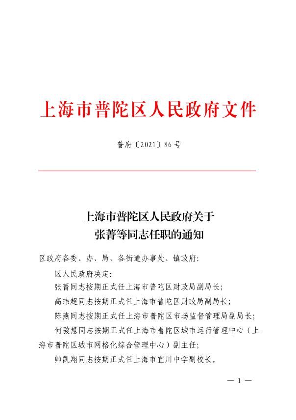 上海市普陀区人民政府关于张菁等同志任职的通知
