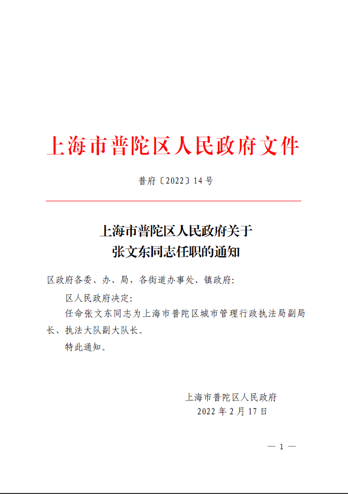 任命张文东同志为上海市普陀区城市管理行政执法局副局长、执法大队副大队长。