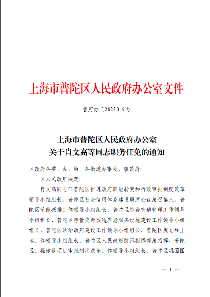 肖文高同志任普陀区推进政府职能转变和行政审批制度改革领导小组组长、普陀区社会信用体系建设联席会议总召集人、普陀区节能减排工作领导小组组长、普陀区综合交通管理工作领导小组组长、普陀区存量资源改造养老服务设施建设工作领导小组组长、普陀区法治政府建设工作领导小组组长、普陀区规划和土地工作领导小组组长、普陀区人民政府防汛指挥部总指挥、普陀区工程建设项目审批制度改革工作领导小组组长、普陀区巩固国家卫生区领导小组组长、普陀区公立医院管理委员会主任、普陀区自然灾害防治委员会主任、普陀区质量工作领导小组组长、普陀区拆除违法建筑领导小组组长、普陀区投资促进工作领导小组组长、普陀区企业上市服务工作领导小组组长;