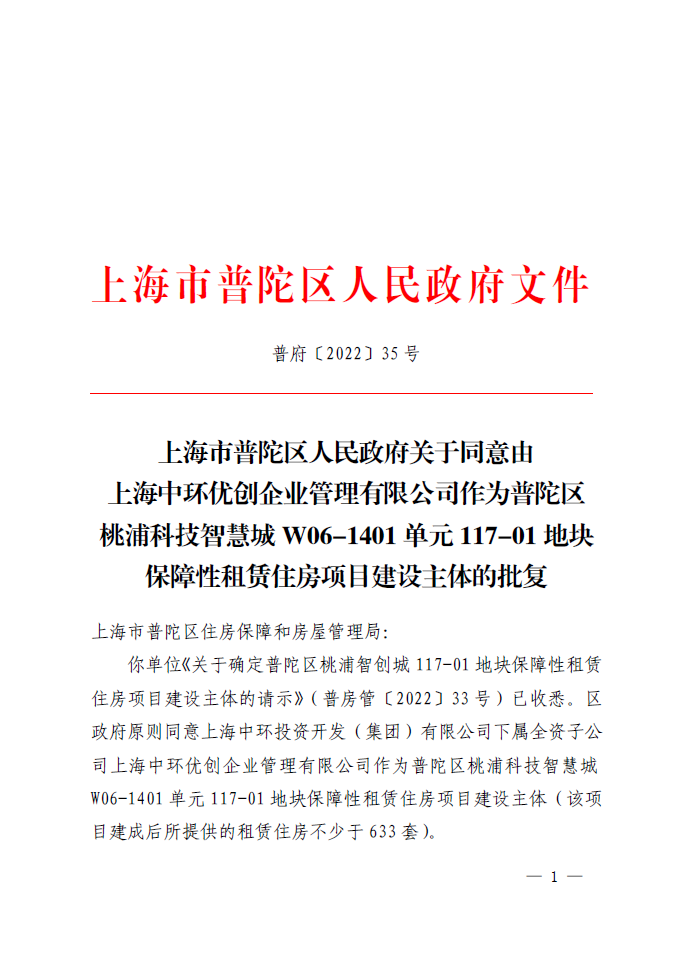 你单位《关于确定普陀区桃浦智创城117-01地块保障性租赁住房项目建设主体的请示》(普房管〔2022〕33号)已收悉。区政府原则同意上海中环投资开发(集团)有限公司下属全资子公司上海中环优创企业管理有限公司作为普陀区桃浦科技智慧城W06-1401单元117-01地块保障性租赁住房项目建设主体(该项目建成后所提供的租赁住房不少于633套)。