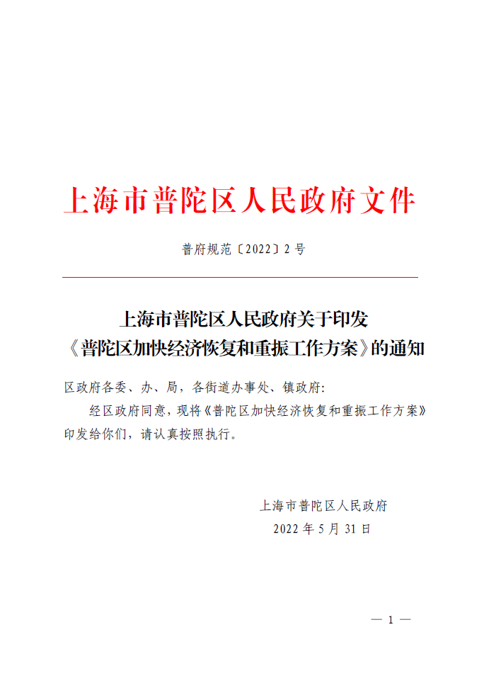 上海市普陀区人民政府关于印发《普陀区加快经济恢复和重振工作方案》的通知