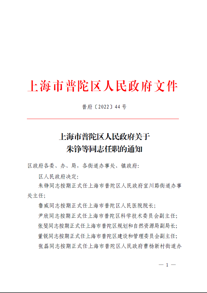 上海市普陀区人民政府关于朱铮等同志任职的通知