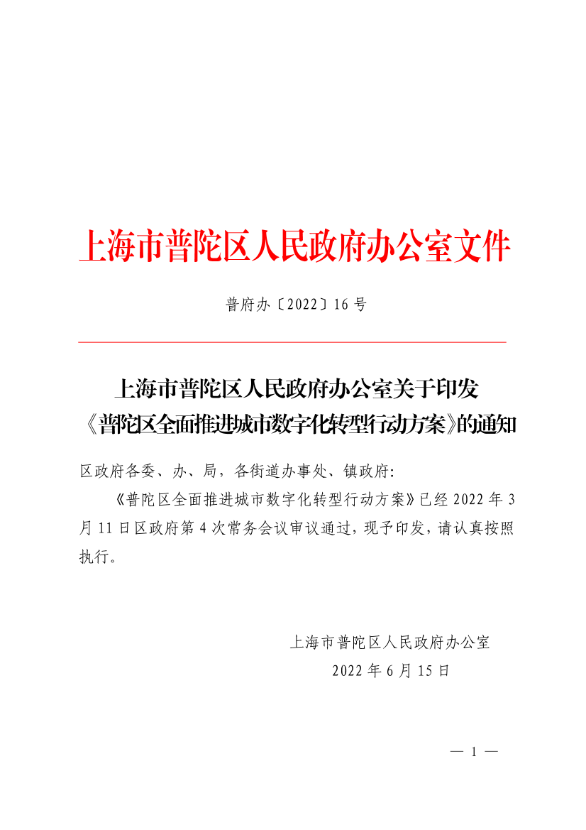 上海市普陀区人民政府办公室关于印发《普陀区全面推进城市数字化转型行动方案》的通知