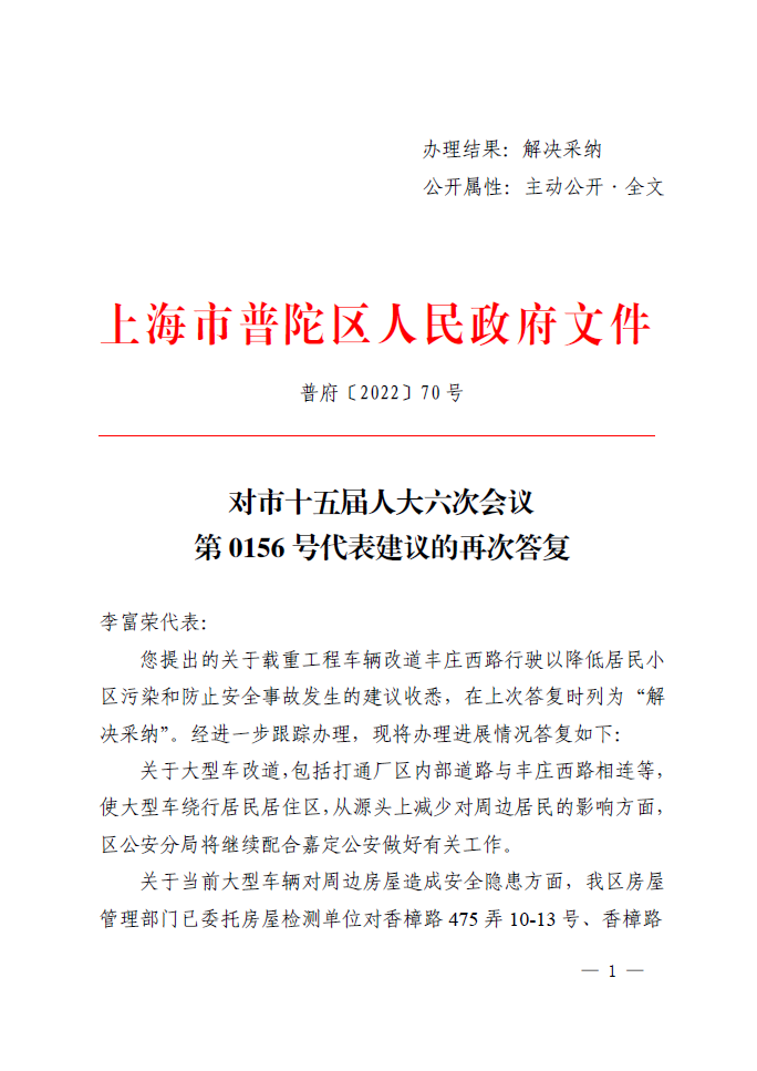 关于大型车改道,包括打通厂区内部道路与丰庄西路相连等,使大型车绕行居民居住区,从源头上减少对周边居民的影响方面,区公安分局将继续配合嘉定公安做好有关工作。