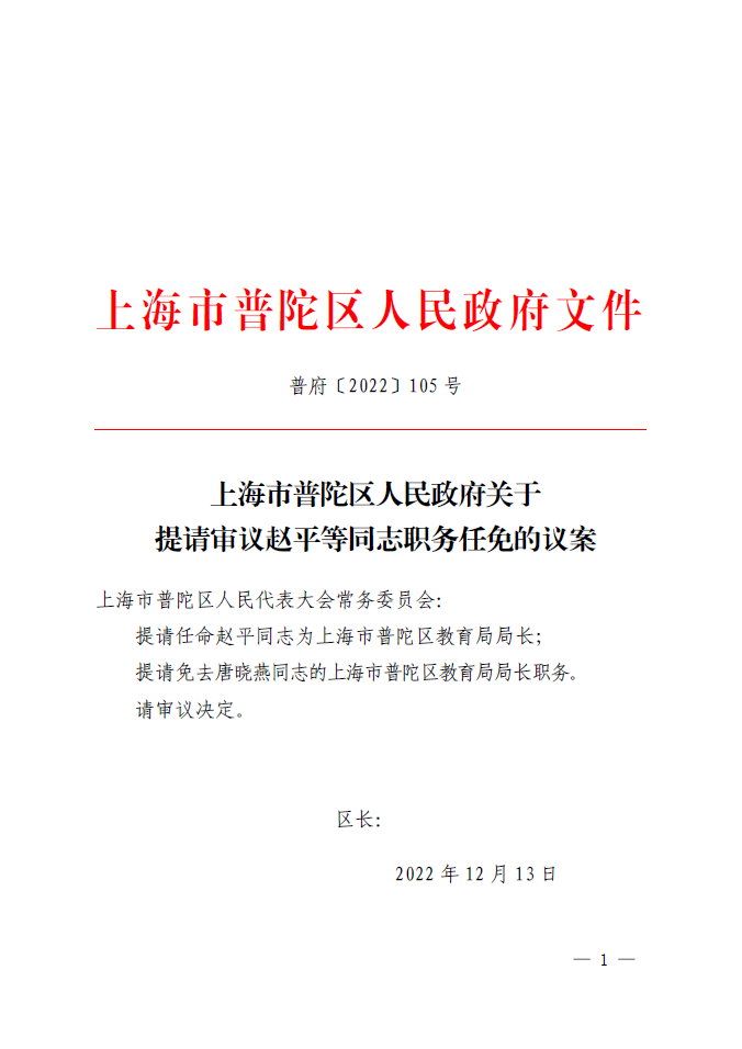 提请免去唐晓燕同志的上海市普陀区教育局局长职务。