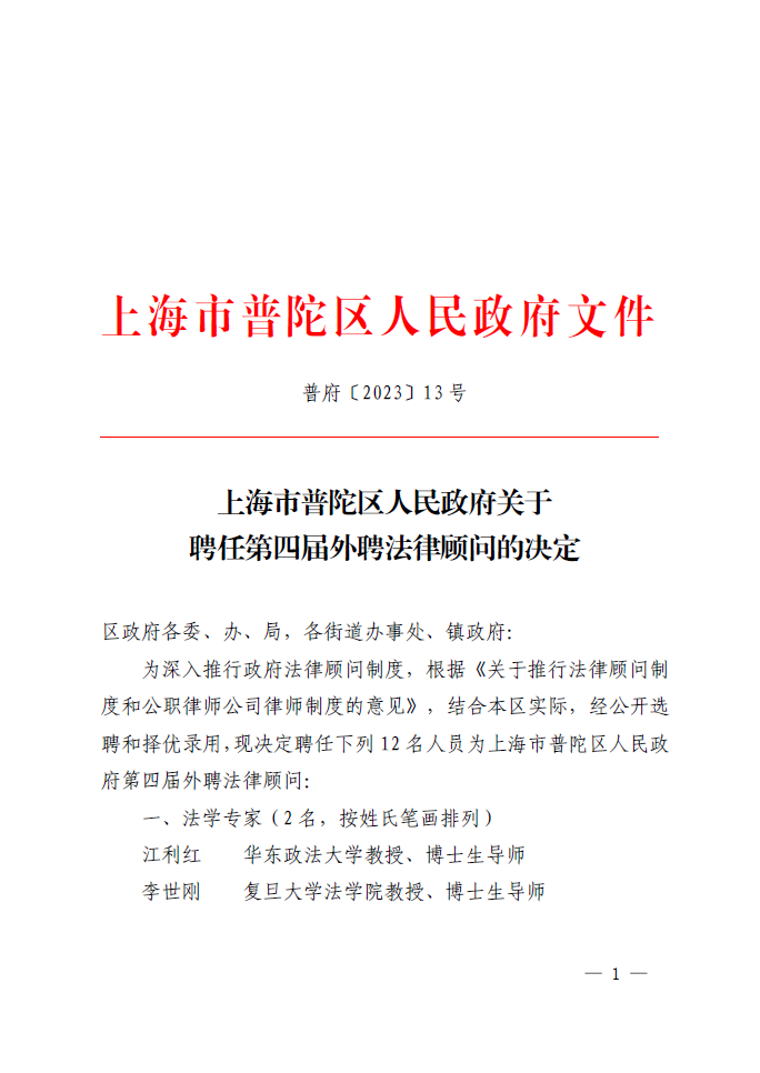 为深入推行政府法律顾问制度,根据《关于推行法律顾问制度和公职律师公司律师制度的意见》,结合本区实际,经公开选聘和择优录用,现决定聘任下列12名人员为上海市普陀区人民政府第四届外聘法律顾问: