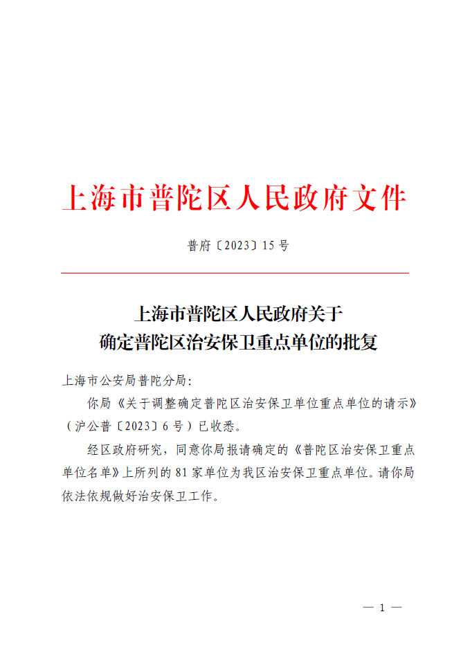 你局《关于调整确定普陀区治安保卫单位重点单位的请示》(沪公普〔2023〕6号)已收悉。